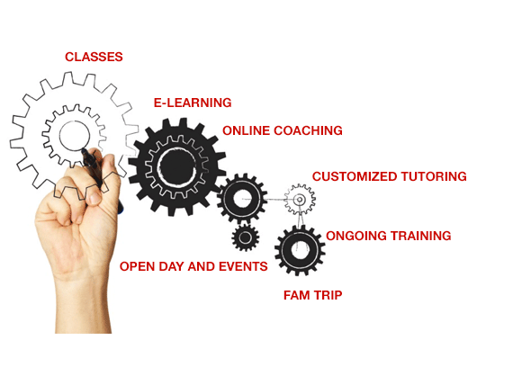 Comienza con un ‘‘Curso básico’’ en el que se adquieren todos los conocimientos para al cliente, las reservas e interactuar con los diversos actores del mercado. Una vez terminado el primer paso, se enriquecen constantemente con eventos de formación, día a día, sesiones online, eventos en vivo, educativos y todo lo que pueda contribuir al crecimiento profesional y personal.